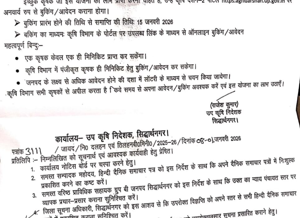 राज्य सरकार द्वारा निःशुल्क दलहन एवं तिलहन बीज मिनी किट वितरण एवं प्रसार कार्यक्रम के अन्तर्गत जायद-2026 में उर्द एवं मूंग के बीज मिनी किट को निःशुल्क उपलब्ध कराए जायेंगे। उक्त आशय की जानकारी उप कृषि निदेशक सिद्धार्थनगर राजेश कुमार ने कहीं। उन्होंने बताया कि उक्त मिनी किट लाभार्थियों का चयन लॉटरी पद्धति द्वारा जिलाधिकारी की अध्यक्षता में गठित जिला स्तरीय समिति के माध्यम से कृषकों का चयन किया जायेगा। इच्छुक कृषक जो इस योजना का लाभ प्राप्त करना चाहते है, उन्हे कृषि दर्शन-2 पोर्टल एचटीटीपीएस:agridarshan.up.gov.in पर अनिवार्य रुप से बुकिंग/आवेदन कराना होगा। बुकिंग प्रारम्भ होने की तिथि से समाप्ति की तिथि 15 जनवरी 2026 है। वहीं बुकिंग का माध्यम कृषि विभाग के पोर्टल पर उपलब्ध लिंक के माध्यम से ऑनलाइन बुकिंग/आवेदन है। आपको बता दें कि एक कृषक केवल एक ही मिनी किट प्राप्त कर सकेंगा। कृषि विभाग में पंजीकृत कृषक ही मिनी किट हेतु बुकिंग/आवेदन कर सकेगा। जनपद के लक्ष्य से अधिक आवेदन होने की दशा में लॉटरी के माध्यम से चयन किया जायेगा। कृषि विभाग सभी कृषकों से अपील करता है कि वे समय से अपना आवेदन / बुकिंग आवश्यक करें एवं इस योजना का लाभ उठाएं।