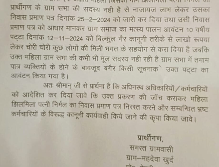 विकास खण्ड नौगढ़ के महदेवा खुर्द गांव के ग्रामीणों ने लेखपाल की मिलीभगत से अज्ञात महिला को ग्राम सभा की सदस्य बनाने का गम्भीर आरोप लगाते हुए मंगलवार को जिलाधिकारी शिवशरणप्पा जी.एन. को ज्ञापन सौंपा है। आपको बता दें कि महदेवा खुर्द गांव के समस्त ग्रामवासियों डीएम को दिये ज्ञापन में कहा कि हल्का लेखपाल द्वारा एक अज्ञात महिला जिसका नाम झिलमिला पत्नी निर्मल जो प्रार्थीगण के ग्राम सभा की सदस्य नही है, से नाजायज लाभ लेकर उसका निवास प्रमाण पत्र दिनांक 25-2-2024 को जारी कर दिया तथा उसी निवास प्रमाण पत्र को आधार मानकर ग्राम समाज का मत्स्य पालन आवन्टन 10 वर्षीय पट्टा दिनांक 12-11-2024 को बिल्कुल गैर कानूनी तरीके से लाखों रूपया लेकर चोरी-चोरी कुछ लोगों की मिलीभगत के सहयोग से करा दिया है। जबकि उक्त महिला ग्राम सभा की कभी भी मूल सदस्य नही रही है। वहीं ग्राम सभा में तमाम पात्र व्यक्तियों के होने के बावजूद बगैर किसी सूचना के उक्त पट्टा का आवन्टन किया गया है। इसलिए डीएम साहब आप अपने अधिनस्थ अधिकारियों/कर्मचारियों को आदेशित कर दिया जावें कि उक्त प्रकरण की जांच कराकर महिला झिलमिला पत्नी निर्मल का निवास प्रमाण पत्र निरस्त करने और सम्बन्धित भ्रष्ट कर्मचारियों के विरूद्ध कानूनी कार्यवाही करें।