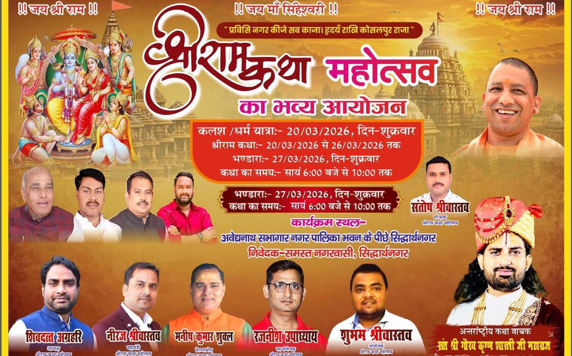 सिद्धार्थनगर में श्रीराम कथा महोत्सव का भव्य आयोजन अवेद्यनाथ सभागार, नगर पालिका परिषद भवन के पीछे आयोजित किया जाएगा। इस पवित्र आयोजन की तैयारी बड़े उत्साह और श्रद्धा के साथ की जा रही है। नगरवासी सामूहिक रूप से इस महोत्सव को ऐतिहासिक बनाने के लिए सहयोग कर रहे हैं। कार्यक्रम में प्रसिद्ध कथा वाचक द्वारा भगवान श्रीराम के जीवन, आदर्शों और मर्यादा पुरुषोत्तम स्वरूप का वर्णन किया जाएगा। महोत्सव के दौरान भव्य मंच सज्जा, सुंदर झांकियाँ, भजन संध्या और सांस्कृतिक कार्यक्रमों का आयोजन भी किया जाएगा। प्रतिदिन कथा श्रवण के लिए श्रद्धालु दूर-दूर से आएंगे। नगर के प्रमुख व्यक्तियों, सामाजिक संस्थाओं और प्रशासनिक अधिकारियों द्वारा व्यवस्था की गई है ताकि श्रद्धालुओं को किसी प्रकार की असुविधा न हो। संध्या काल में आरती और दीप प्रज्वलन के साथ वातावरण भक्ति भाव से ओतप्रोत हो जाएगा। प्रसाद वितरण और सामूहिक भंडारे की भी विशेष व्यवस्था की जाएगी। यह श्रीराम कथा महोत्सव नगरवासियों के लिए आध्यात्मिक जागृति, भक्ति और एकता का प्रतीक बनेगा। निवेदक — समस्त नगरवासी, सिद्धार्थनगर।