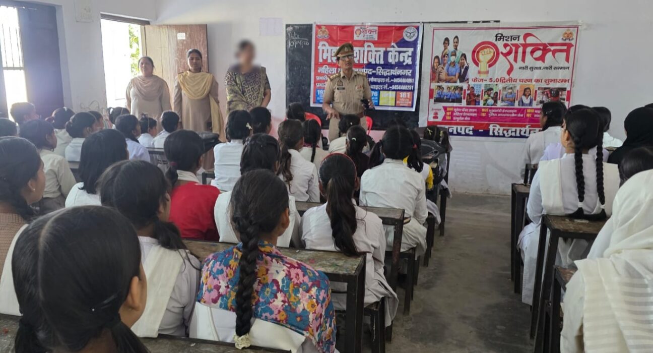 वरिष्ठ पुलिस अधीक्षक सिद्धार्थनगर डॉ0 अभिषेक महाजन द्वारा महिलाओं एवं बालिकाओं की सुरक्षा में चलाए जा रहे अभियान के तहत आज दिनांक 10.04.2026 को अपर पुलिस अधीक्षक प्रशांत कुमार प्रसाद के पर्यवेक्षण में क्षेत्राधिकारी सदर विश्वजीत शौरयान के कुशल नेतृत्व में प्रभारी निरीक्षक महिला थाना भाग्यवती पांडे थाना महिला जनपद सिद्धार्थनगर के कुशल नेतृत्व में मिशन शक्ति फेज 5.0 द्वितीय चरण के तहत थाना क्षेत्र सिद्धार्थनगर के बाल शिक्षा सदन कन्या इण्टर कालेज बुद्ध नगर सिद्धार्थनगर में जनचौपाल लगाकर महिलाओं एवं बालिकाओं को मिशन शक्ति के संबंध में सरकार द्वारा चलाई जा रही महिला सम्बन्धित विभिन्न सरकारी योजनाओं- प्रधानमंत्री मातृ वंदना योजना, मुख्यमंत्री सामूहिक विवाह योजना, रानी लक्ष्मीबाई बाल एवं महिला सम्मान कोष, नारी शक्ति वंदन अधिनियम, मातृ शक्ति को सम्बल, निराश्रित महिला पेंशन योजना, मुख्यमंत्री कन्या सुमंगला योजना आदि अन्य योजनाओ से संबंधी जानकारी को बताया गया। तथा महिला संबंधी अपराध पर अंकुश लगाने हेतु जारी हेल्प लाइन नम्बरों- 1090 वुमेन पावर लाइन,181 महिला हेल्प लाइन, 1076 मुख्यमंत्री हेल्प लाइन, 112 पुलिस हेल्प लाइन,1098 चाईल्ड केयर लाइन, 108 एम्बुलेंस हेल्प लाइन, 101अग्निशमन हेल्प लाइन, 1930 साइबर हेल्पलाइन नंबर के बारे में जानकारी दी गई तथा पम्पलेट वितरित कर जागरुक किया गया ।